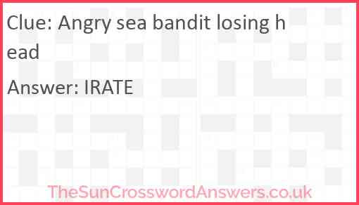 Angry sea bandit losing head is a crossword clue for which we have 1 possible answer and we have spotted 4 times in our database. This crossword clue was last seen on 04 January 2024 in The Sun Cryptic Crossword puzzle!