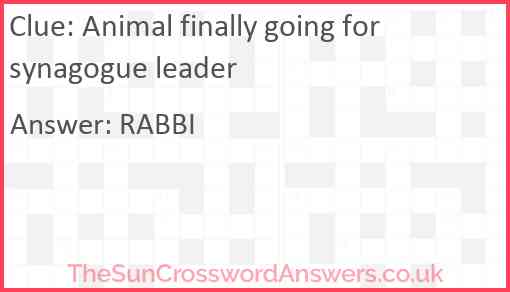 Animal finally going for synagogue leader is a crossword clue for which we have 1 possible answer and we have spotted 2 times in our database. This crossword clue was last seen on 20 December 2024 in The Sun Cryptic Crossword puzzle!