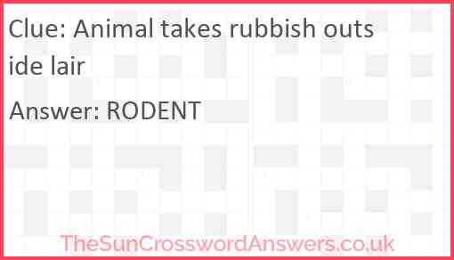 Animal takes rubbish outside lair is a crossword clue for which we have 1 possible answer and we have spotted 1 times in our database. This crossword clue was last seen on 14 June 2020 in The Sun Cryptic Crossword puzzle!