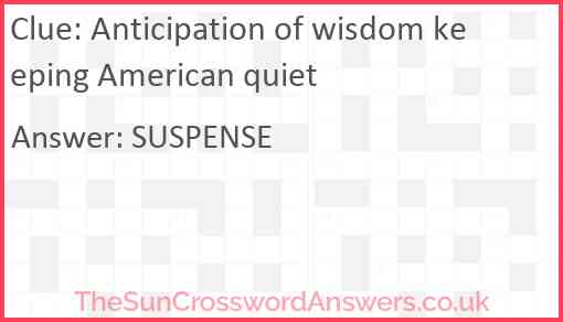 Anticipation of wisdom keeping American quiet is a crossword clue for which we have 1 possible answer and we have spotted 1 times in our database. This crossword clue was last seen on 11 January 2025 in The Sun Cryptic Crossword puzzle!