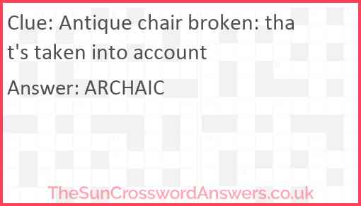 Antique chair broken: that's taken into account is a crossword clue for which we have 1 possible answer and we have spotted 2 times in our database. This crossword clue was last seen on 22 April 2025 in The Sun Cryptic Crossword puzzle!