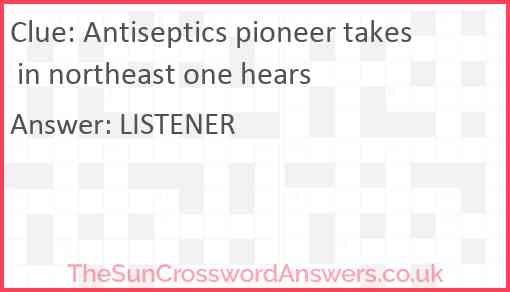 Antiseptics pioneer takes in northeast one hears is a crossword clue for which we have 1 possible answer and we have spotted 1 times in our database. This crossword clue was last seen on 25 October 2024 in The Sun Cryptic Crossword puzzle!