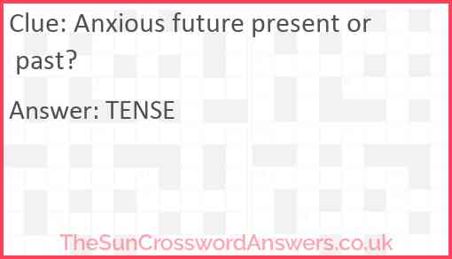 Anxious future present or past? is a crossword clue for which we have 1 possible answer and we have spotted 1 times in our database. This crossword clue was last seen on 16 January 2025 in The Sun Cryptic Crossword puzzle!