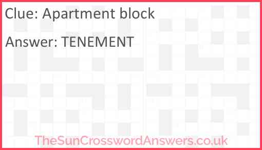 Apartment block is a crossword clue for which we have 1 possible answer and we have spotted 10 times in our database. This crossword clue was last seen on 03 November 2024 in The Sun Coffee Time Crossword puzzle!
