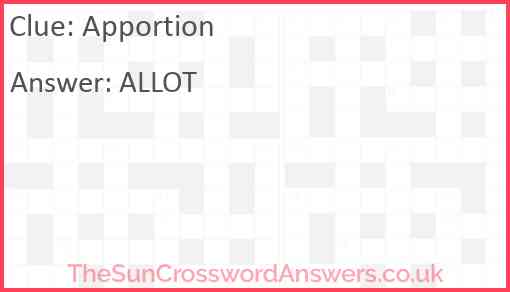 Apportion is a crossword clue for which we have 1 possible answer and we have spotted 6 times in our database. This crossword clue was last seen on 13 July 2024 in The Sun Coffee Time Crossword puzzle!