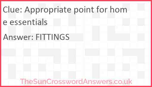Appropriate point for home essentials is a crossword clue for which we have 1 possible answer and we have spotted 1 times in our database. This crossword clue was last seen on 30 December 2024 in The Sun Cryptic Crossword puzzle!