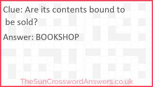 Are its contents bound to be sold? is a crossword clue for which we have 1 possible answer and we have spotted 1 times in our database. This crossword clue was last seen on 23 March 2025 in The Sun Cryptic Crossword puzzle!