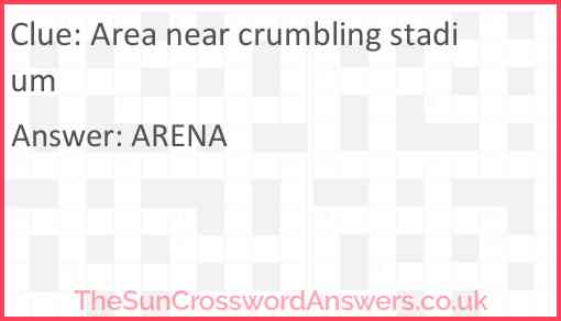 Area near crumbling stadium is a crossword clue for which we have 1 possible answer and we have spotted 4 times in our database. This crossword clue was last seen on 07 March 2025 in The Sun Cryptic Crossword puzzle!