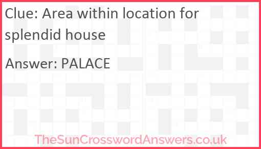 Area within location for splendid house is a crossword clue for which we have 1 possible answer and we have spotted 1 times in our database. This crossword clue was last seen on 21 September 2021 in The Sun Cryptic Crossword puzzle!