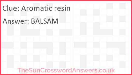 Aromatic resin is a crossword clue for which we have 1 possible answer and we have spotted 1 times in our database. This crossword clue was last seen on 25 August 2022 in The Sun Coffee Time Crossword puzzle!
