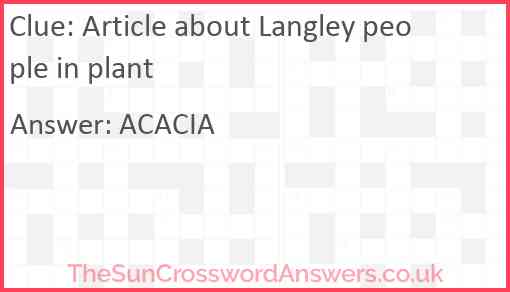 Article about Langley people in plant is a crossword clue for which we have 1 possible answer and we have spotted 2 times in our database. This crossword clue was last seen on 03 August 2023 in The Sun Cryptic Crossword puzzle!
