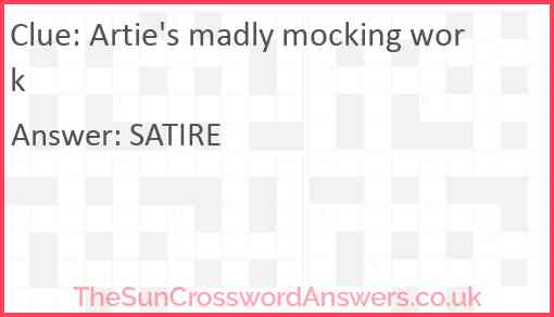 Artie's madly mocking work is a crossword clue for which we have 1 possible answer and we have spotted 1 times in our database. This crossword clue was last seen on 30 March 2024 in The Sun Cryptic Crossword puzzle!