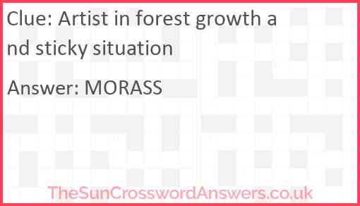 Artist in forest growth and sticky situation is a crossword clue for which we have 1 possible answer and we have spotted 3 times in our database. This crossword clue was last seen on 18 December 2022 in The Sun Cryptic Crossword puzzle!