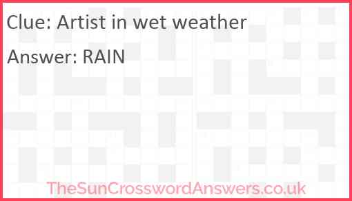 Artist in wet weather is a crossword clue for which we have 1 possible answer and we have spotted 3 times in our database. This crossword clue was last seen on 02 April 2024 in The Sun Cryptic Crossword puzzle!