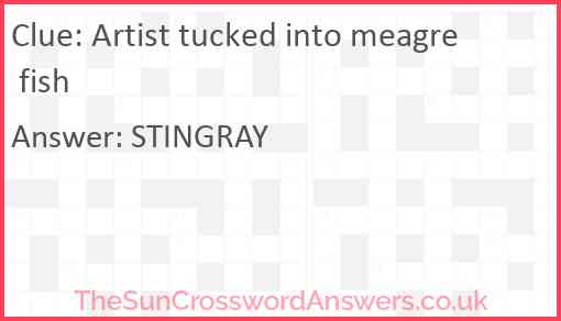 Artist tucked into meagre fish is a crossword clue for which we have 1 possible answer and we have spotted 2 times in our database. This crossword clue was last seen on 12 August 2023 in The Sun Cryptic Crossword puzzle!