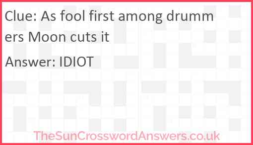 As fool first among drummers Moon cuts it is a crossword clue for which we have 1 possible answer and we have spotted 1 times in our database. This crossword clue was last seen on 21 April 2024 in The Sun Cryptic Crossword puzzle!