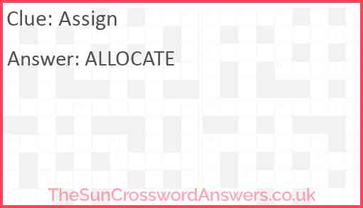 Assign is a crossword clue for which we have 1 possible answer and we have spotted 5 times in our database. This crossword clue was last seen on 07 February 2025 in The Sun Coffee Time Crossword puzzle!