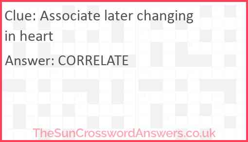 Associate later changing in heart is a crossword clue for which we have 1 possible answer and we have spotted 1 times in our database. This crossword clue was last seen on 11 December 2020 in The Sun Cryptic Crossword puzzle!