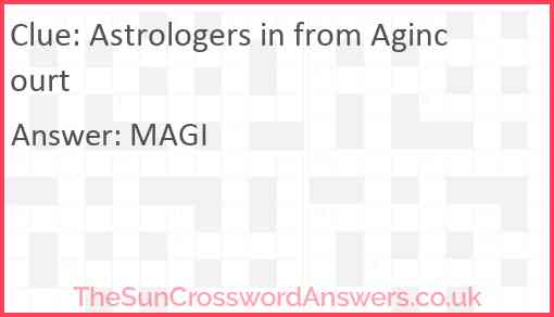 Astrologers in from Agincourt is a crossword clue for which we have 1 possible answer and we have spotted 1 times in our database. This crossword clue was last seen on 08 September 2020 in The Sun Cryptic Crossword puzzle!