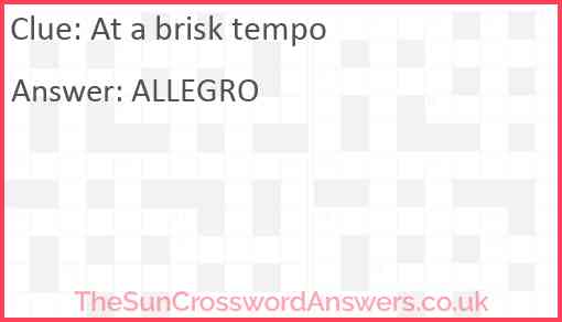 At a brisk tempo is a crossword clue for which we have 1 possible answer and we have spotted 2 times in our database. This crossword clue was last seen on 12 August 2019 in The Sun Coffee Time Crossword puzzle!