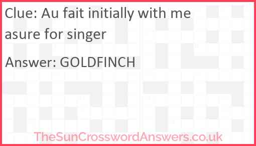 Au fait initially with measure for singer is a crossword clue for which we have 1 possible answer and we have spotted 1 times in our database. This crossword clue was last seen on 27 May 2021 in The Sun Cryptic Crossword puzzle!