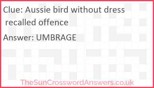 Aussie bird without dress recalled offence is a crossword clue for which we have 1 possible answer and we have spotted 2 times in our database. This crossword clue was last seen on 12 December 2023 in The Sun Cryptic Crossword puzzle!