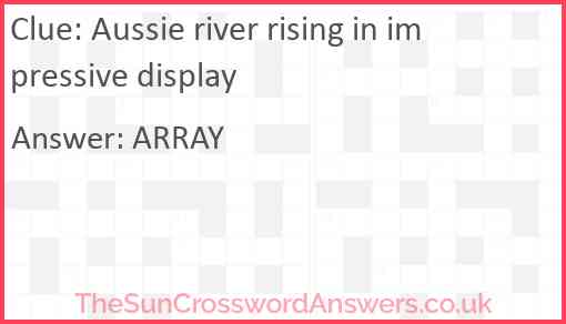 Aussie river rising in impressive display is a crossword clue for which we have 1 possible answer and we have spotted 3 times in our database. This crossword clue was last seen on 29 July 2024 in The Sun Cryptic Crossword puzzle!
