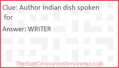 Author Indian dish spoken for is a crossword clue for which we have 1 possible answer and we have spotted 1 times in our database. This crossword clue was last seen on 15 November 2022 in The Sun Cryptic Crossword puzzle!