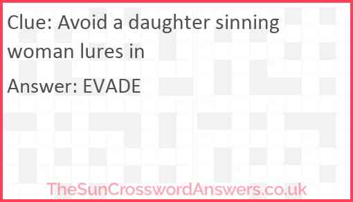 Avoid a daughter sinning woman lures in is a crossword clue for which we have 1 possible answer and we have spotted 2 times in our database. This crossword clue was last seen on 23 November 2024 in The Sun Cryptic Crossword puzzle!