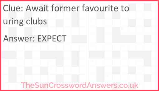 Await former favourite touring clubs is a crossword clue for which we have 1 possible answer and we have spotted 3 times in our database. This crossword clue was last seen on 10 March 2024 in The Sun Cryptic Crossword puzzle!