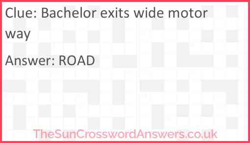 Bachelor exits wide motorway is a crossword clue for which we have 1 possible answer and we have spotted 3 times in our database. This crossword clue was last seen on 25 September 2024 in The Sun Cryptic Crossword puzzle!