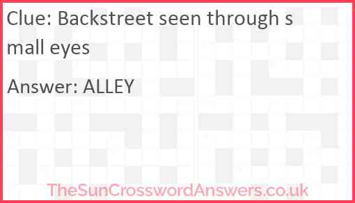 Backstreet seen through small eyes is a crossword clue for which we have 1 possible answer and we have spotted 4 times in our database. This crossword clue was last seen on 09 October 2023 in The Sun Cryptic Crossword puzzle!