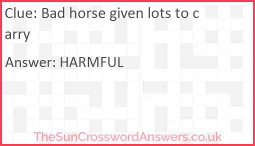 Bad horse given lots to carry is a crossword clue for which we have 1 possible answer and we have spotted 2 times in our database. This crossword clue was last seen on 07 June 2023 in The Sun Cryptic Crossword puzzle!