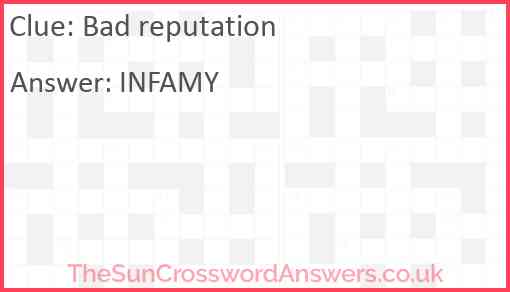 Bad reputation is a crossword clue for which we have 1 possible answer and we have spotted 3 times in our database. This crossword clue was last seen on 25 August 2023 in The Sun Coffee Time Crossword puzzle!