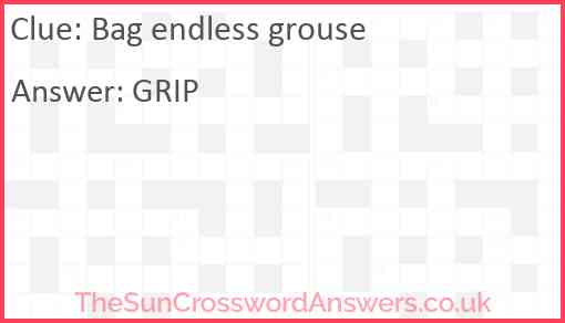 Bag endless grouse is a crossword clue for which we have 1 possible answer and we have spotted 2 times in our database. This crossword clue was last seen on 28 July 2024 in The Sun Cryptic Crossword puzzle!