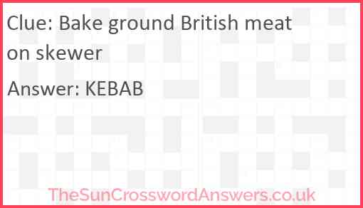 Bake ground British meat on skewer is a crossword clue for which we have 1 possible answer and we have spotted 4 times in our database. This crossword clue was last seen on 26 May 2022 in The Sun Cryptic Crossword puzzle!