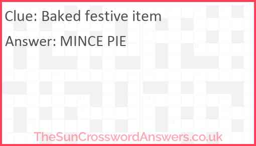 Baked festive item is a crossword clue for which we have 2 possible answer and we have spotted 3 times in our database. This crossword clue was last seen on 22 December 2024 in The Sun Coffee Time Crossword puzzle!
