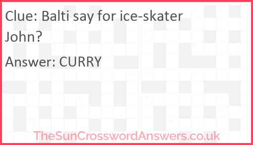 Balti say for ice-skater John? is a crossword clue for which we have 1 possible answer and we have spotted 1 times in our database. This crossword clue was last seen on 27 December 2024 in The Sun Cryptic Crossword puzzle!
