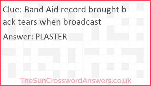 Band Aid record brought back tears when broadcast is a crossword clue for which we have 1 possible answer and we have spotted 1 times in our database. This crossword clue was last seen on 05 December 2022 in The Sun Cryptic Crossword puzzle!