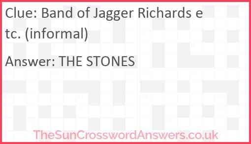 Band of Jagger Richards etc. (informal) is a crossword clue for which we have 1 possible answer and we have spotted 1 times in our database. This crossword clue was last seen on 18 April 2019 in The Sun Coffee Time Crossword puzzle!