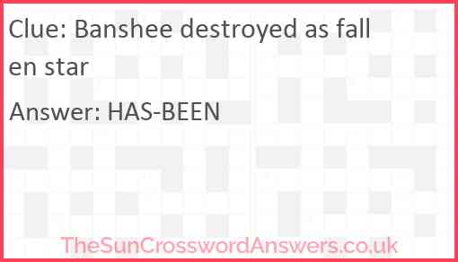 Banshee destroyed as fallen star is a crossword clue for which we have 2 possible answer and we have spotted 2 times in our database. This crossword clue was last seen on 14 December 2023 in The Sun Cryptic Crossword puzzle!