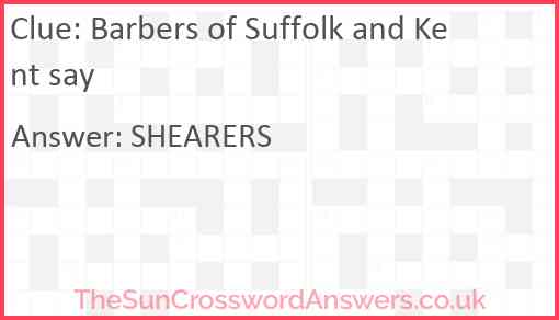 Barbers of Suffolk and Kent say is a crossword clue for which we have 1 possible answer and we have spotted 2 times in our database. This crossword clue was last seen on 19 January 2025 in The Sun Cryptic Crossword puzzle!