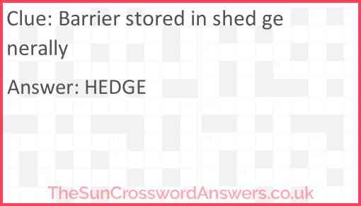 Barrier stored in shed generally is a crossword clue for which we have 1 possible answer and we have spotted 5 times in our database. This crossword clue was last seen on 04 May 2024 in The Sun Cryptic Crossword puzzle!