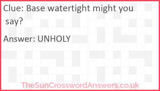 Base watertight might you say? is a crossword clue for which we have 1 possible answer and we have spotted 2 times in our database. This crossword clue was last seen on 06 December 2022 in The Sun Cryptic Crossword puzzle!