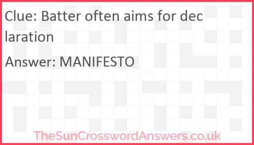 Batter often aims for declaration is a crossword clue for which we have 1 possible answer and we have spotted 4 times in our database. This crossword clue was last seen on 06 February 2025 in The Sun Cryptic Crossword puzzle!