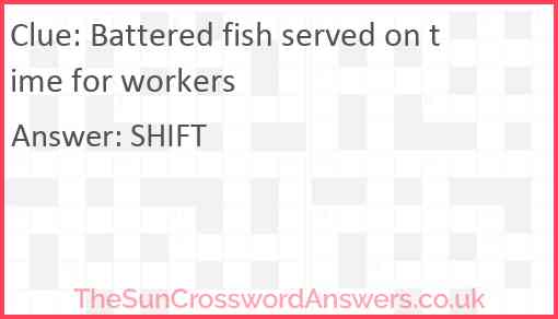 Battered fish served on time for workers is a crossword clue for which we have 1 possible answer and we have spotted 2 times in our database. This crossword clue was last seen on 24 September 2024 in The Sun Cryptic Crossword puzzle!