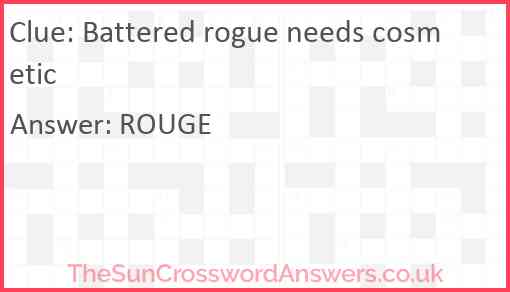 Battered rogue needs cosmetic is a crossword clue for which we have 1 possible answer and we have spotted 2 times in our database. This crossword clue was last seen on 12 July 2024 in The Sun Cryptic Crossword puzzle!