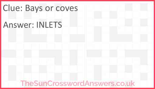 Bays or coves is a crossword clue for which we have 1 possible answer and we have spotted 2 times in our database. This crossword clue was last seen on 10 February 2024 in The Sun Coffee Time Crossword puzzle!