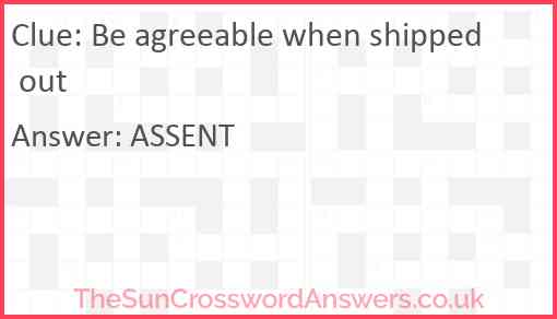 Be agreeable when shipped out is a crossword clue for which we have 1 possible answer and we have spotted 3 times in our database. This crossword clue was last seen on 15 December 2023 in The Sun Cryptic Crossword puzzle!