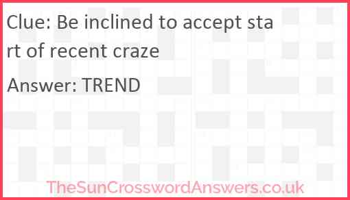 Be inclined to accept start of recent craze is a crossword clue for which we have 1 possible answer and we have spotted 1 times in our database. This crossword clue was last seen on 09 May 2022 in The Sun Cryptic Crossword puzzle!